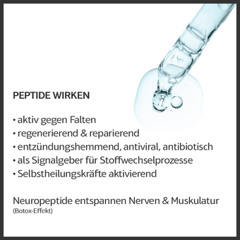 Gleich 12 Signalgeber für regenerierende Stoffwechselprozesse, sogenannte Power-Peptide, sind in der Maskenmixtur gebunden. Dieser einzigartige Peptid-Komplex aktiviert Reparaturprozesse am strapazierten Stützgewebe und fördert dessen Feuchtigkeitsversorgung. Zusätzlich entspannen spezielle Peptide die formgebende Muskulatur, was eine Glättung der darüberliegenden Hautstrukturen zur Folge hat.